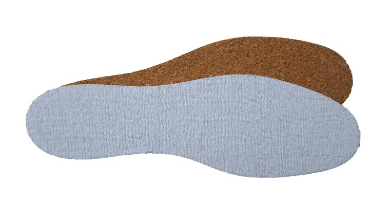 Für die Frottee-Kork Einlegesohle wird 100 % Frottee auf Kork kaschiert. Die Frotteauflage ist saugfähig und hemmt die Gerüche. Auf diese Weise klimatisiert und kühlt sie den Fuß.