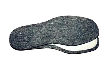 Dieser Artikel wurde auch als "Astronautensohle" bekannt. Wie bei den Wollsohlen, wird die wärmende Wirkung durch Isolation der Kälte erreicht. Hierzu wird eine Aluminiumfolie eingesetzt. Als Polsterung dient ein PU-Schaum. Für den Tragekomfort wird ein Plüschvlies eingesetzt.